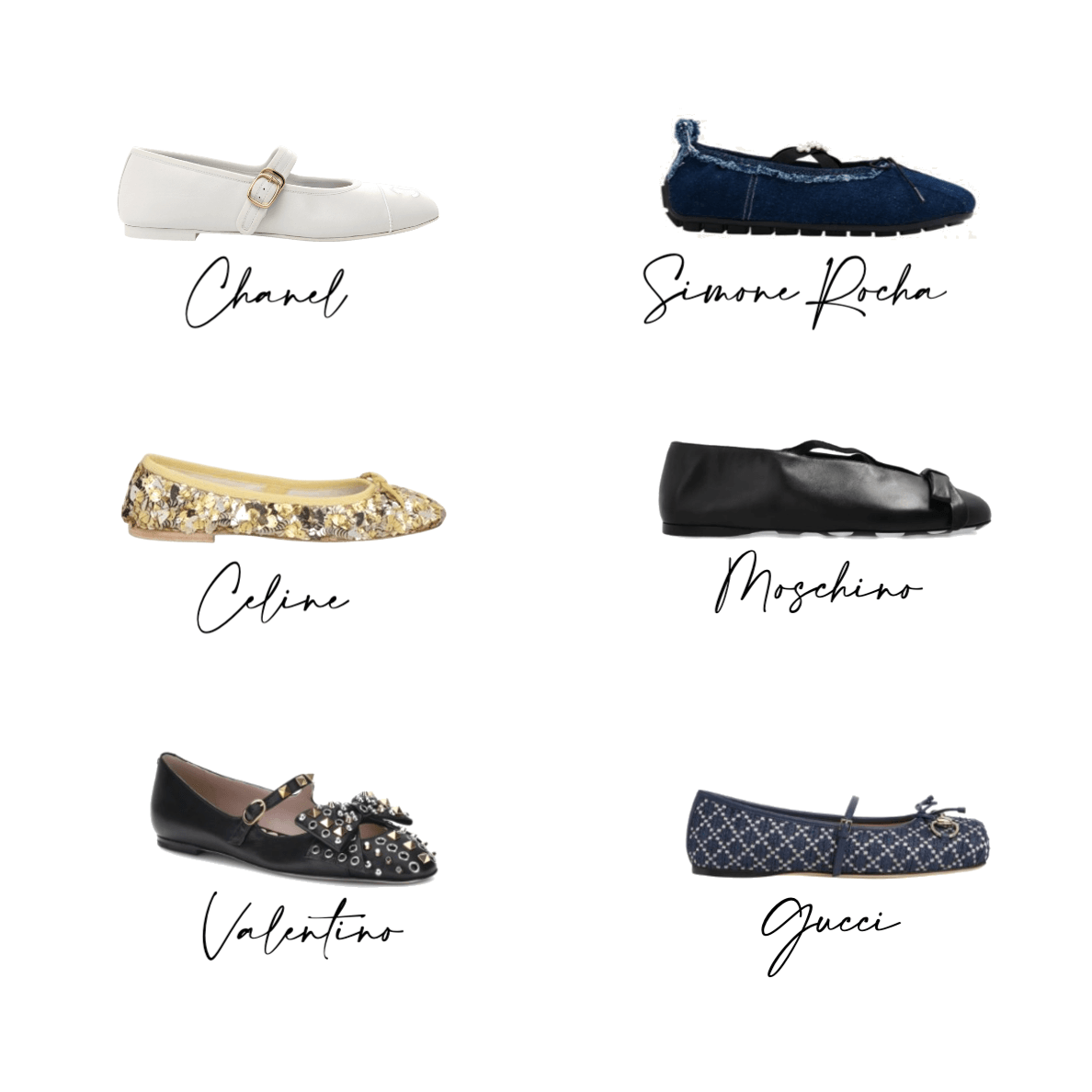 Chanel’s Mary Jane remains a study in restraint—polished, timeless, and endlessly wearable. Simone Rocha brings texture and quiet romance, offering a flat that feels directional yet grounded. Céline’s embellished ballet flat delivers subtle impact, proving that elegance can still shimmer. Moschino’s minimalist leather flat is sharp and unfussy, ideal for clients who prefer clean lines with intention. Valentino adds edge through hardware and detail, grounding feminine silhouettes with strength, while Gucci’s patterned ballet flat introduces heritage and personality without overwhelming a look.